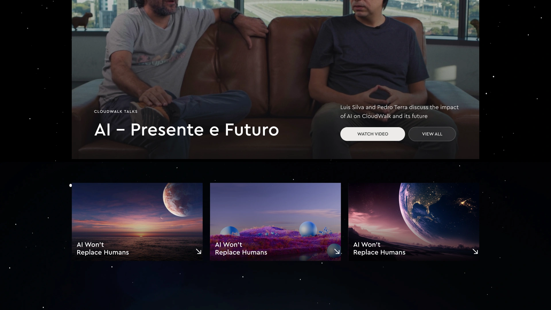 Design and development of a case studies hub focused on CloudWalk's AI initiatives. The goal was to present real applications of AI in the company, using MidJourney for assets and Vanilla JS for animations and logic.